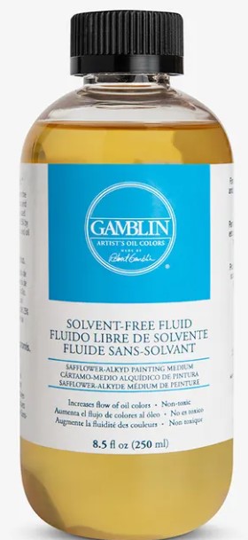 Gamblin Solvent-free fluid er et løsemiddelfri flytende saflor-alkyd malemedium. Saflorolje kommer fra en tistelblomst.